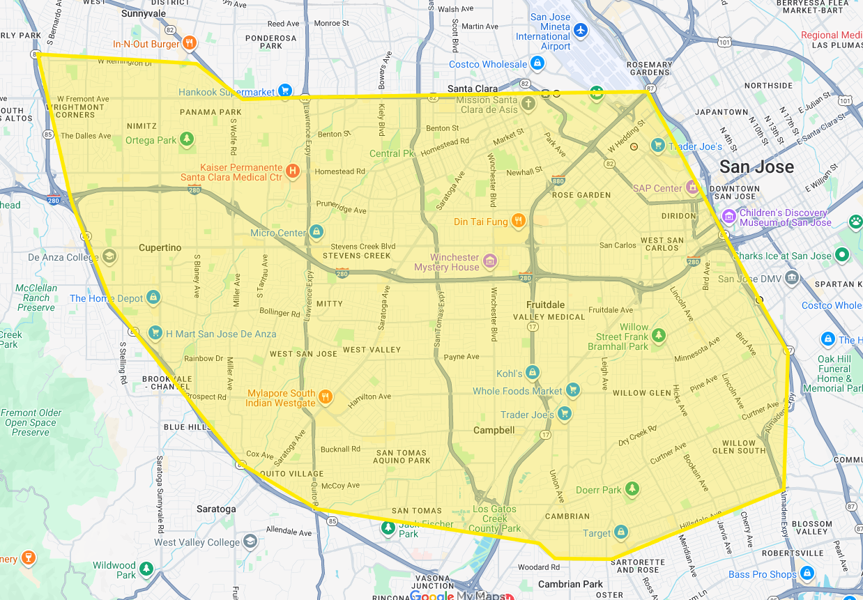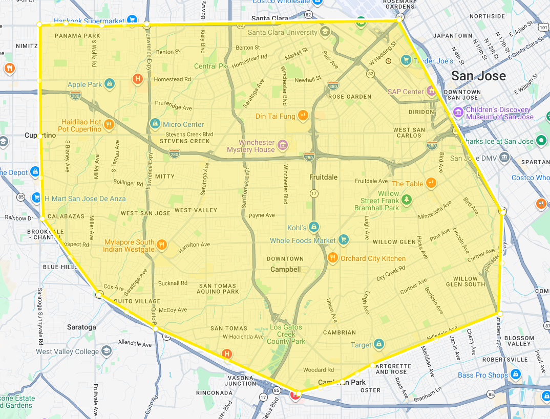 The yellow area is my primary service area. Travel outside this area may be possible with an additional travel fee. Travel fees will range based on service needed and your precise location, but will typically be between $10 - $20.